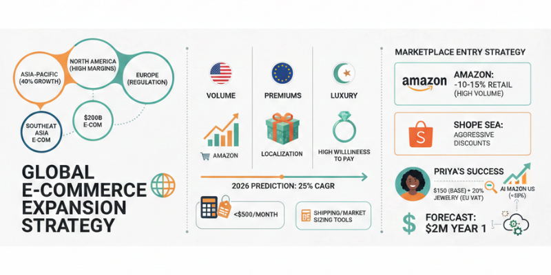Where to expand? Data driven playbook AI commerce expansion highlights Asia-Pacific (40% growth), North America (mature, high margins), and Europe (regulation-heavy). Priya targeted Southeast Asia first—$200B e-com boom, low price pressure on mid-tier jewelry.
